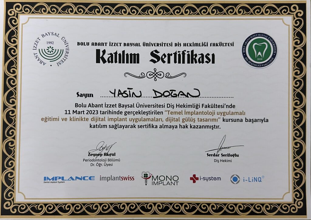 Abant İzzet Baysal Üniversitesi Diş Hekimliği Fakültesi mezunu olan Dt. Yasin Doğan, botoks, dermal dolgu ve masseter botoks gibi estetik uygulamalarla kendini sürekli olarak geliştirmiş ve kliniğimizin Mesul Müdürü olarak görev yapmaktadır. Güler yüzlü ve samimi yaklaşımı ile hastalarının özel ihtiyaçlarını dikkatle dinlemekte ve kişiye özel tedavi planları oluşturmaktadır. Modern tedavi yöntemleri ve hasta odaklı yaklaşımı sayesinde, her hastanın rahatlamasını ve güven duymasını sağlamakta, sağlıklı ve estetik gülüşler kazandırmak için özveriyle çalışmaktadır. Kliniğimizdeki varlığı, hasta memnuniyetini ön planda tutan bir uzman olarak güven ve kaliteyi simgeler.